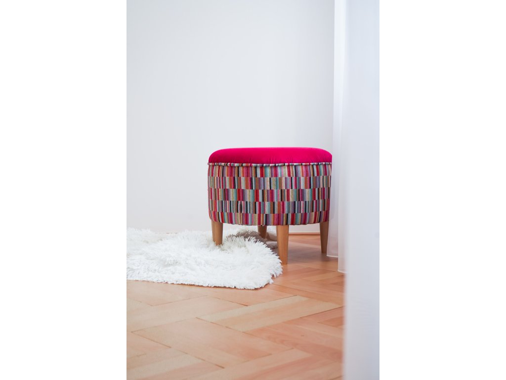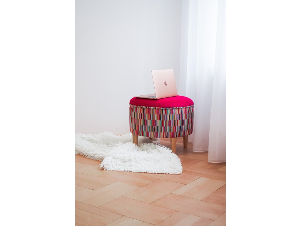 A co tento malinový taburet? I přes jeho výraznou barvu ho dokážete zakombinovat do interiérua to i díky barevným odstínům žluté, světle modré, šedé a dalším barvám, které má po stranách.